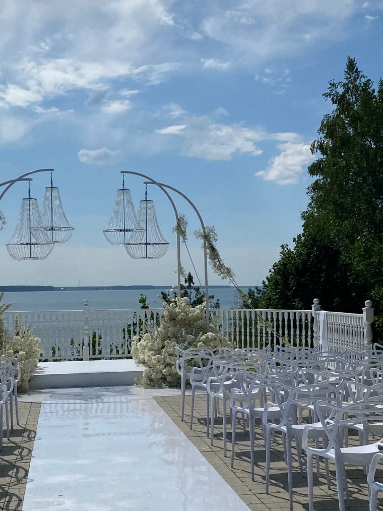 Мы долго искали концепцию, которая подойдет паре по пожеланию и бюджету и в итоге решили оформить место церемонии невесомыми, но при этом, масштабными люстрами, и живыми цветами.