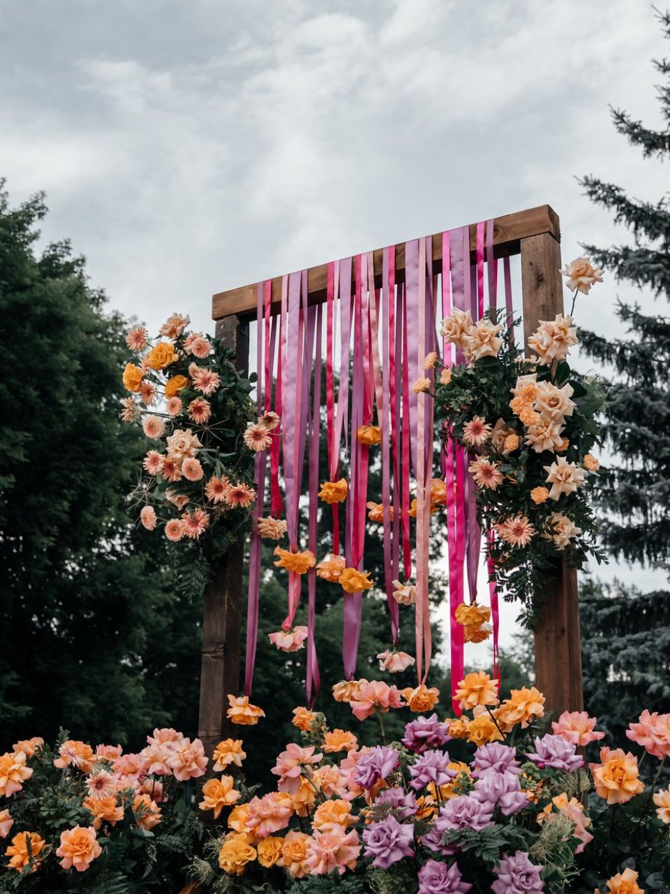 К слову , приглашения и план рассадки тоже были в виде «цветочка». Фон с нежными стропами также был «флористическим». Каждый стол мы оформили собственной «люстрой» из лент, которые были окрашены вручную , флористикой и скатертью с салфетками. Также утренняя съемка пары была наполнена невероятными атмосферными деталями.