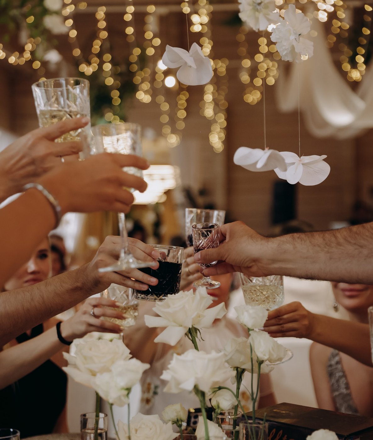 Потолок в зале мы обыграли легкими полотнами и каскадами цветов над каждым столом гостей.