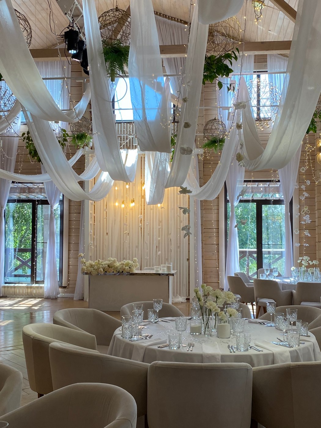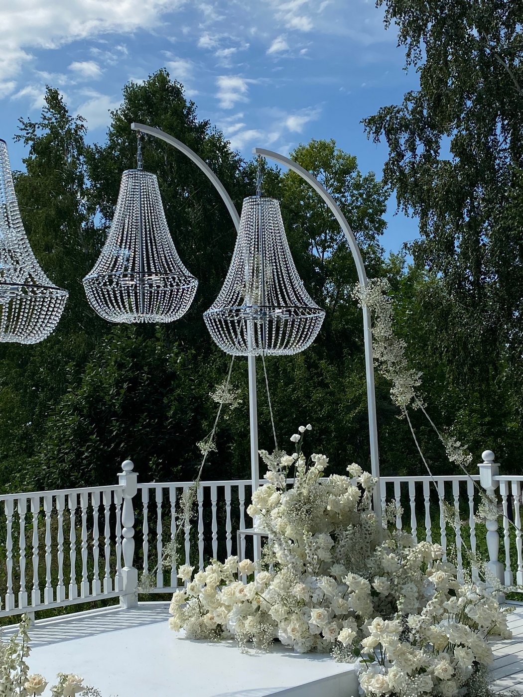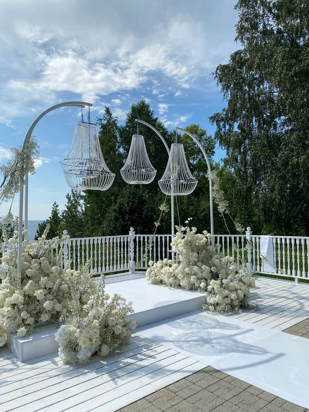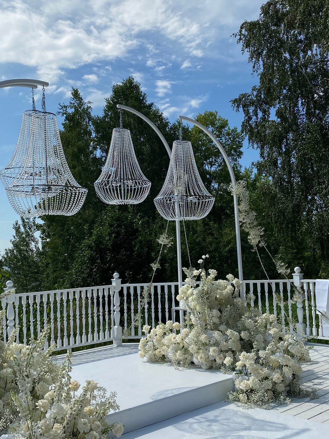 Мы долго искали концепцию, которая подойдет паре по пожеланию и бюджету и в итоге решили оформить место церемонии невесомыми, но при этом, масштабными люстрами, и живыми цветами.