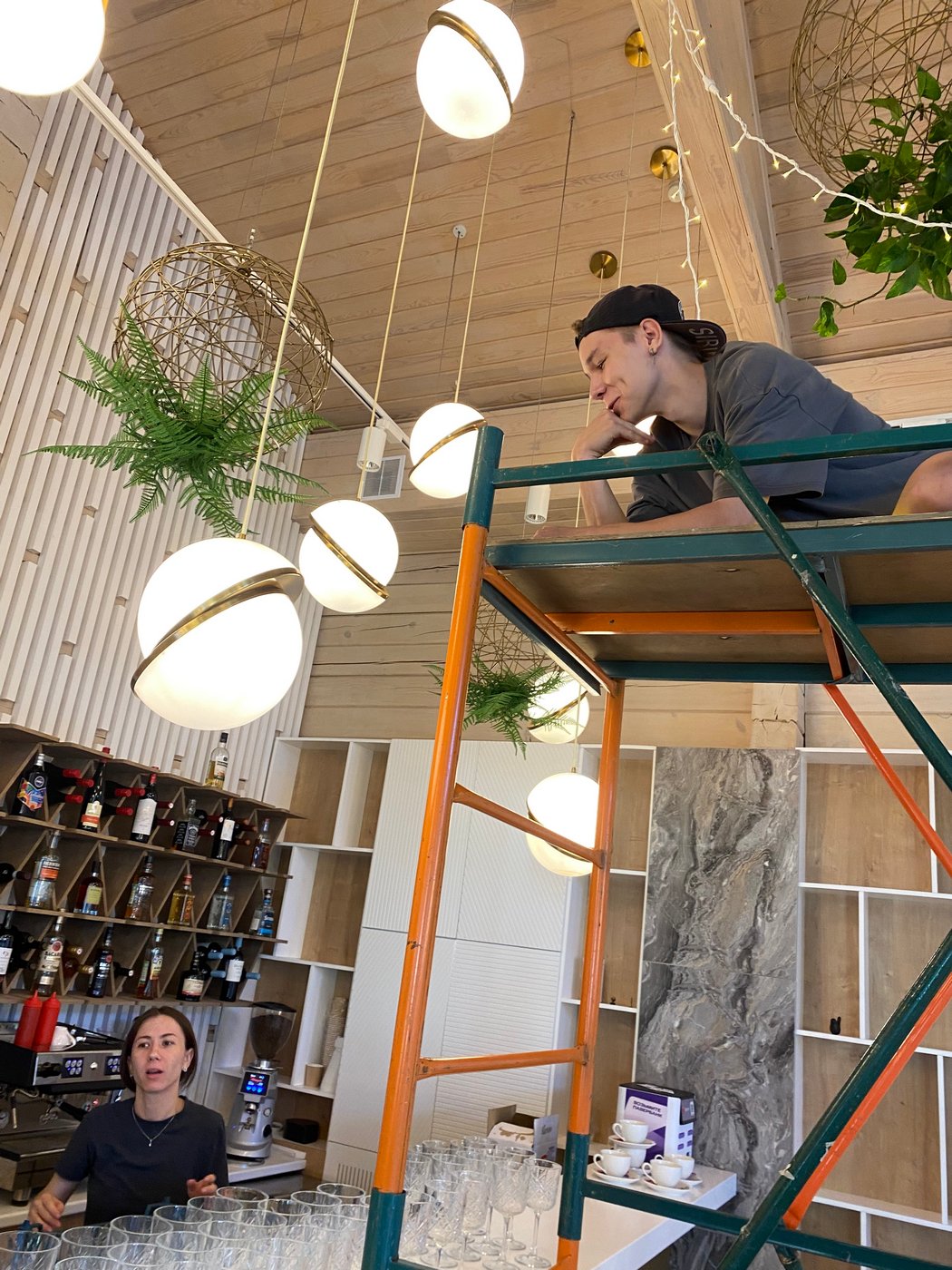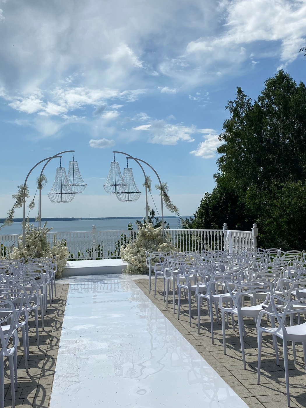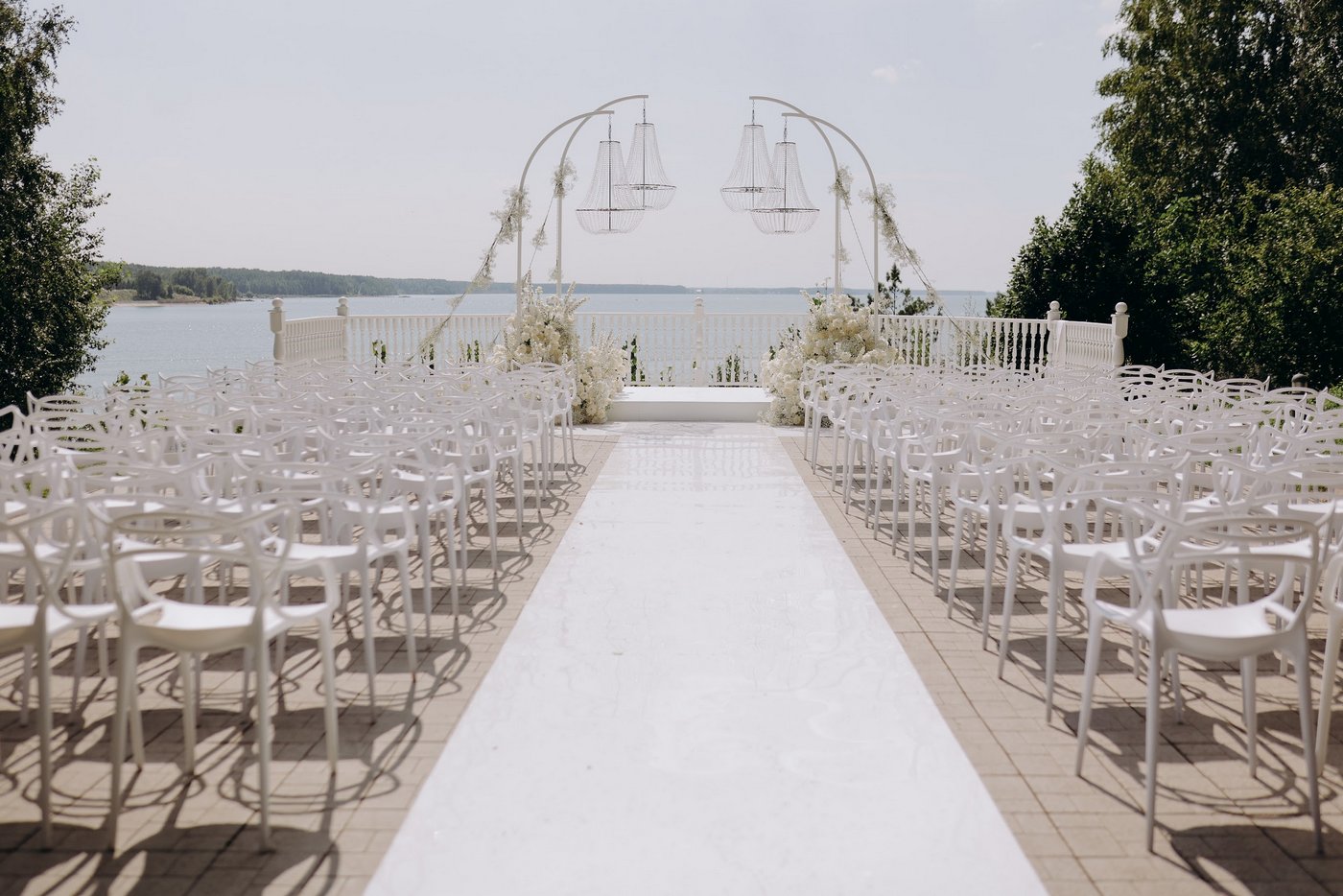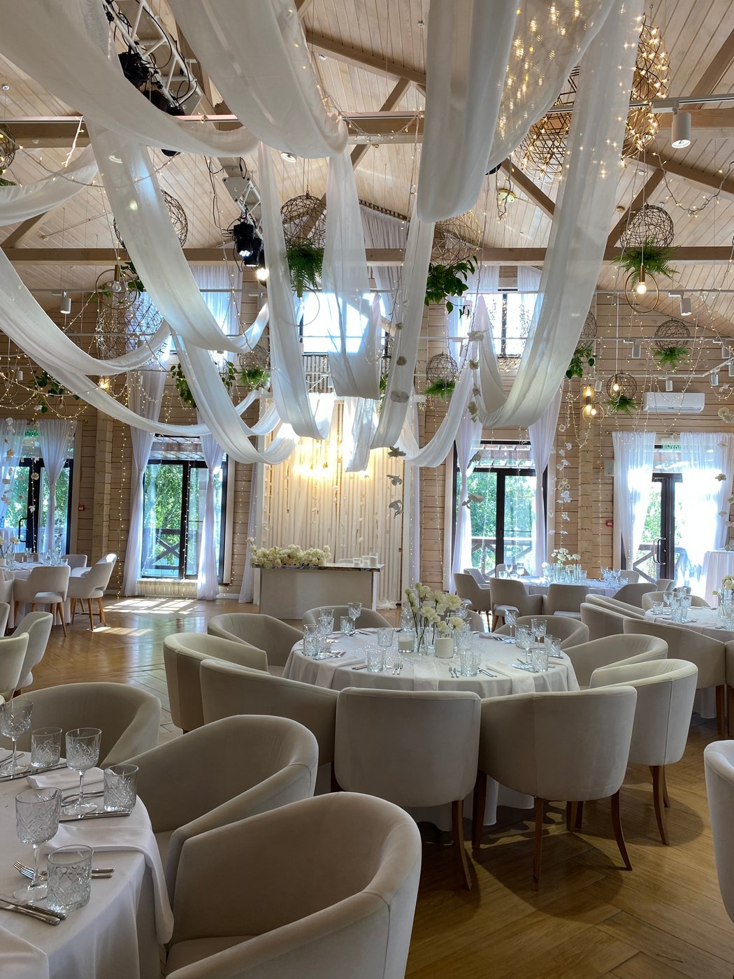 Мы долго искали концепцию, которая подойдет паре по пожеланию и бюджету и в итоге решили оформить место церемонии невесомыми, но при этом, масштабными люстрами, и живыми цветами.