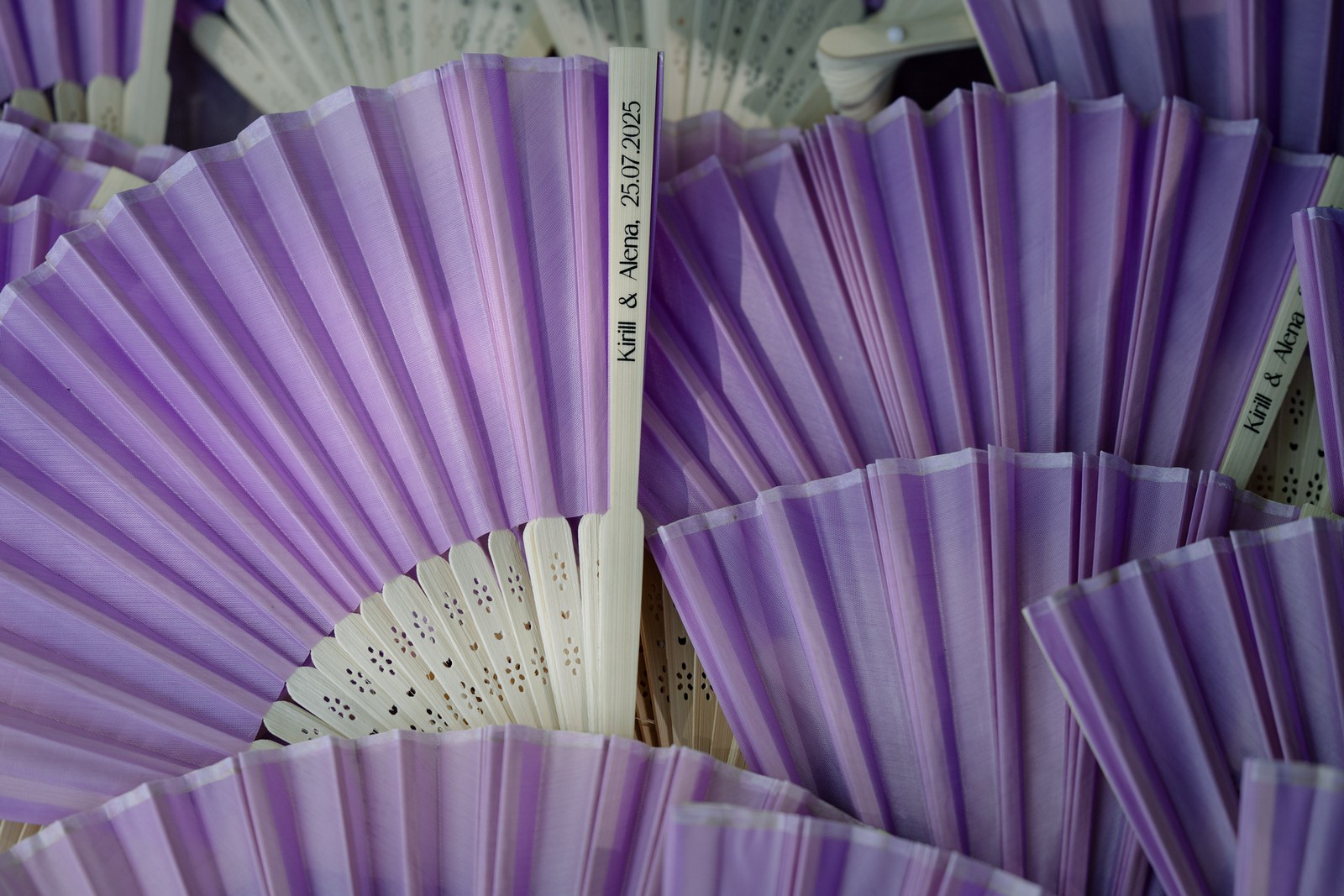 Специально для свадьбы мы отшили юбочки — гофре для скатертей, сделали кастомизированные веера - подарки гостям и план рассадки в виде гармошки.
