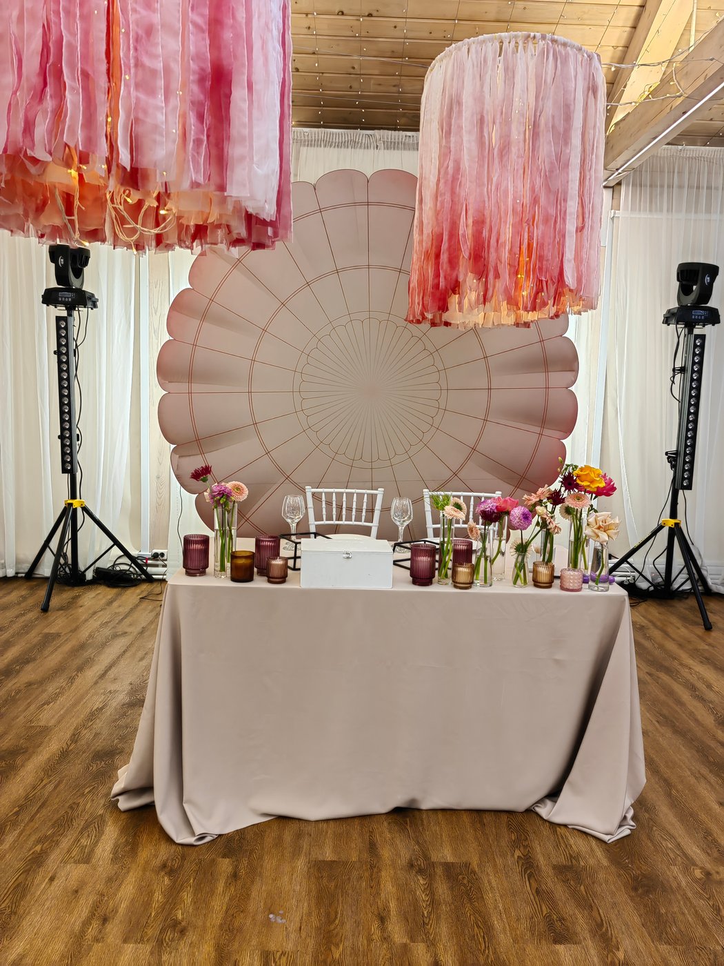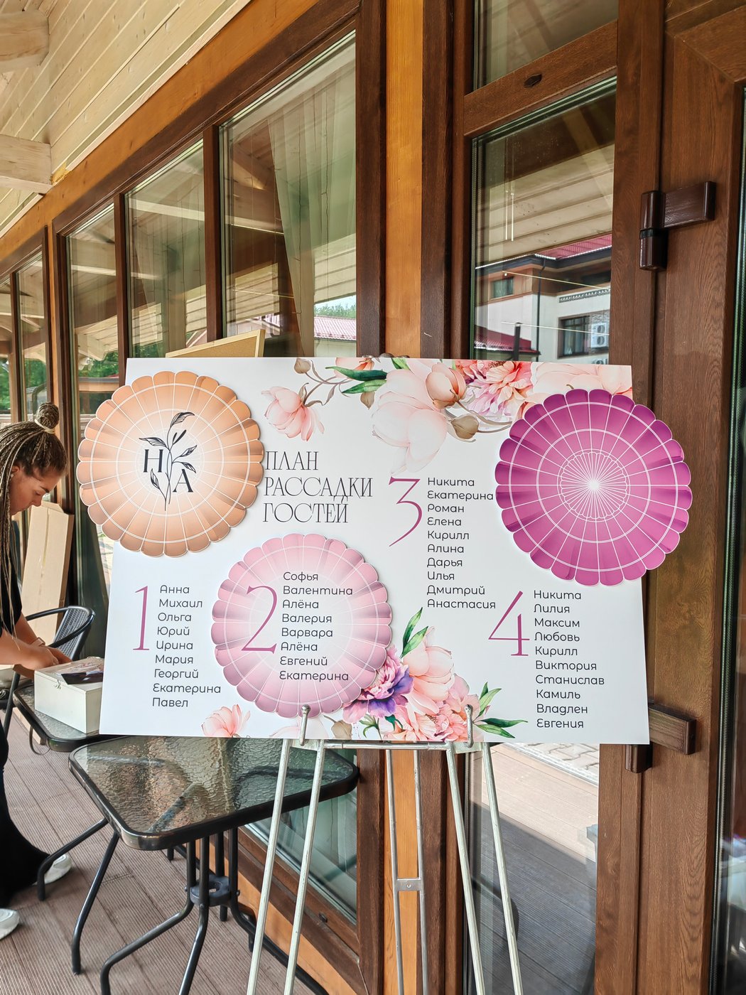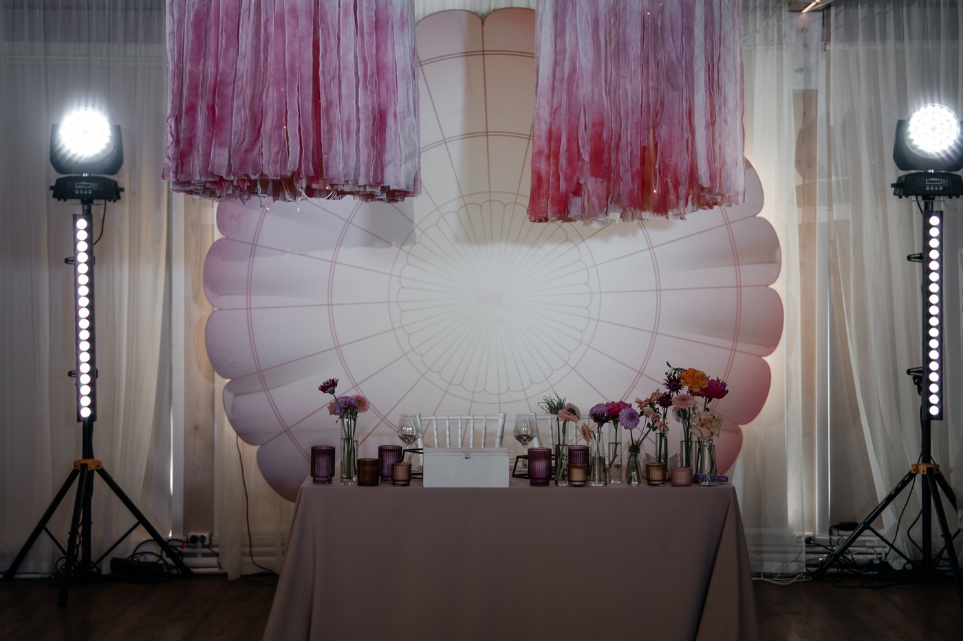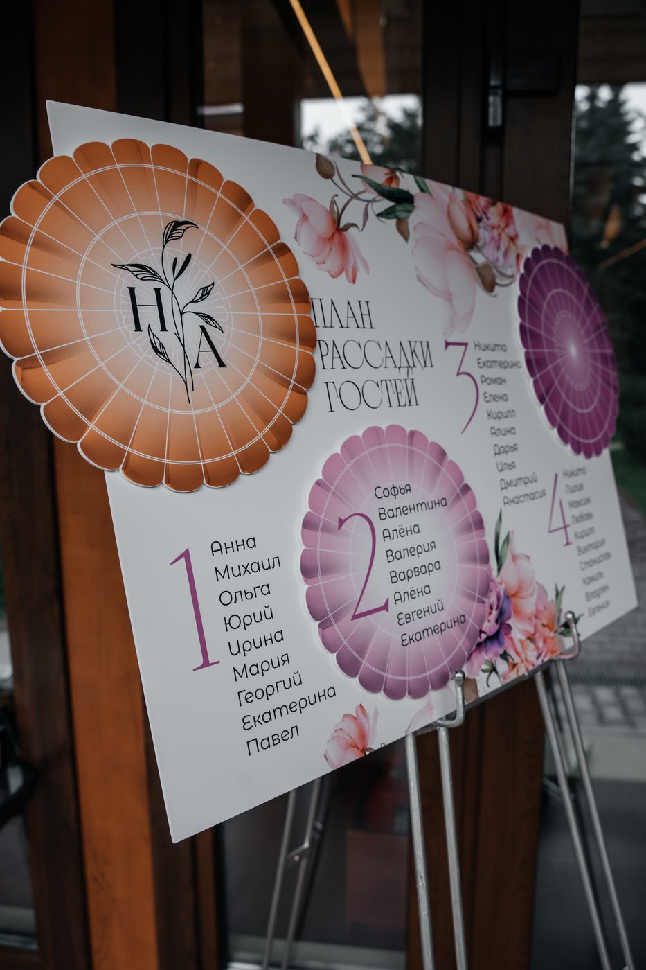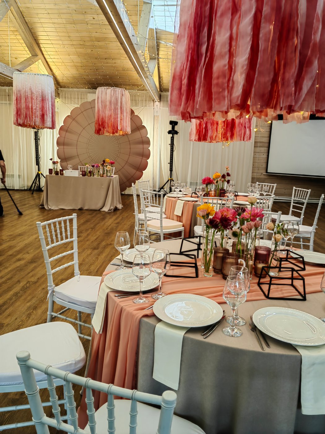 К слову , приглашения и план рассадки тоже были в виде «цветочка». Фон с нежными стропами также был «флористическим». Каждый стол мы оформили собственной «люстрой» из лент, которые были окрашены вручную , флористикой и скатертью с салфетками. Также утренняя съемка пары была наполнена невероятными атмосферными деталями.