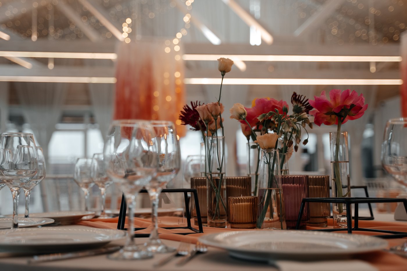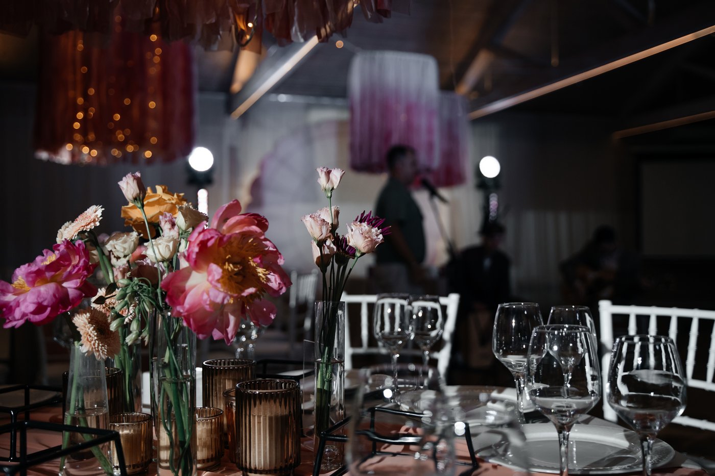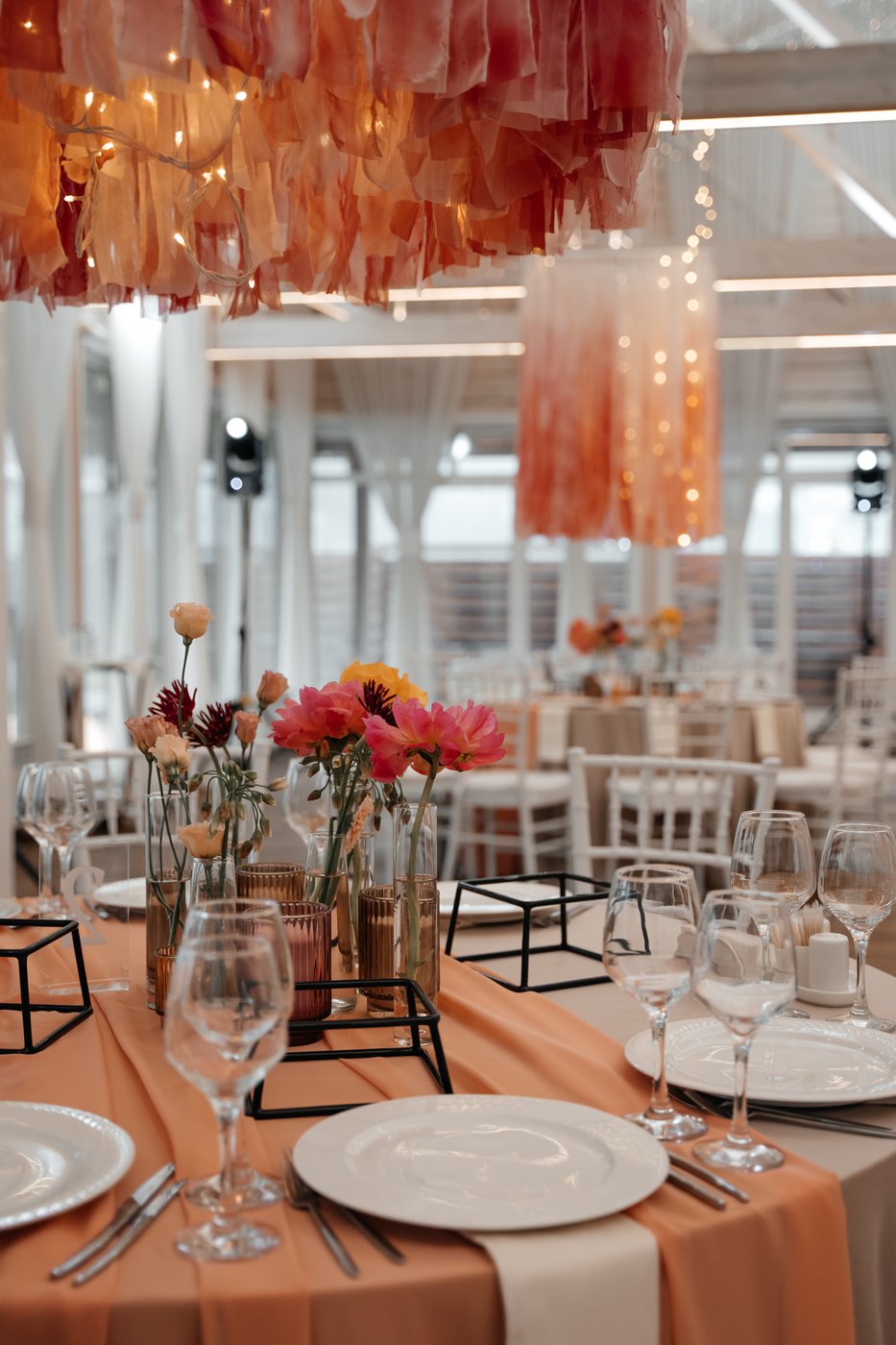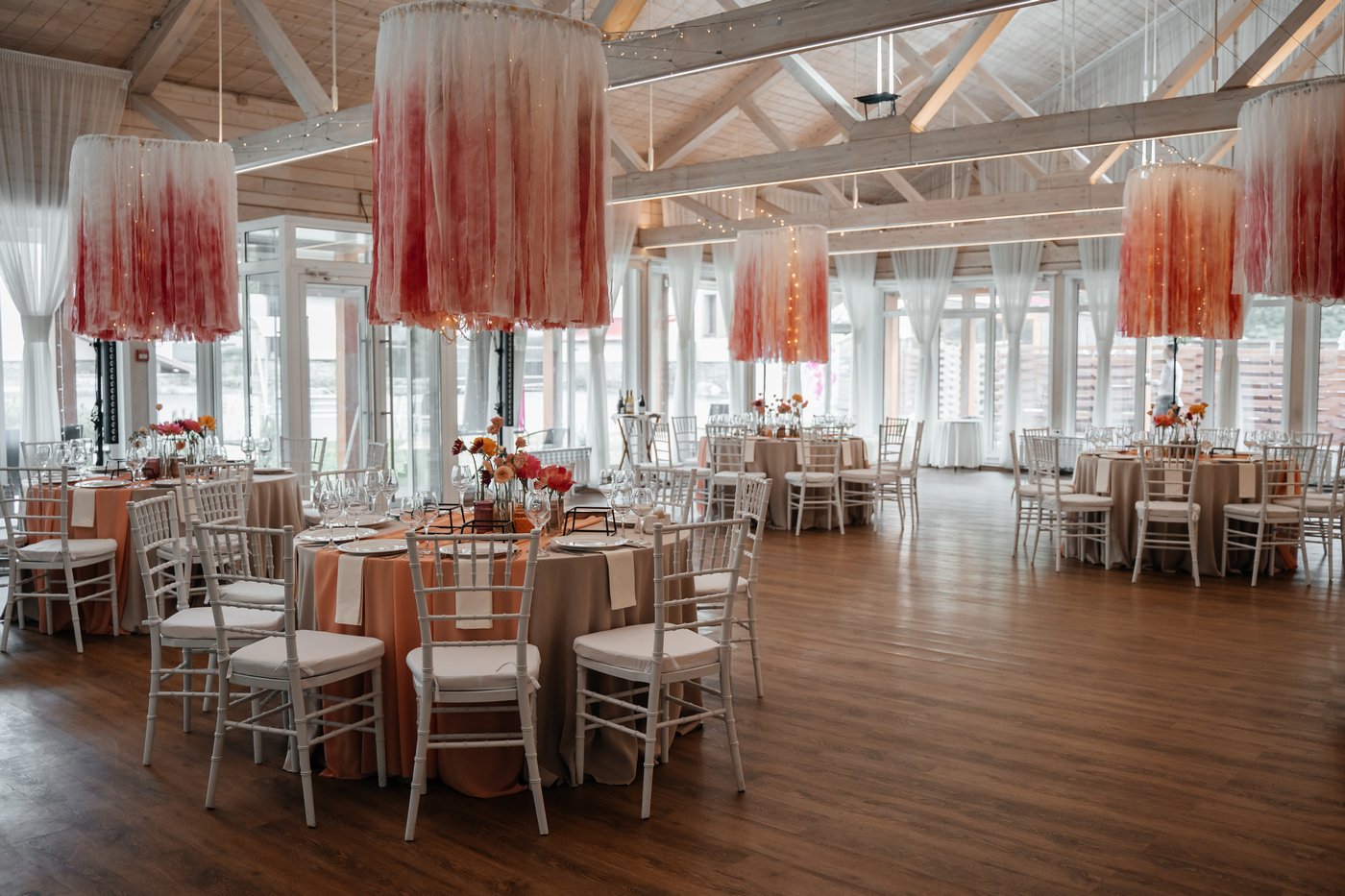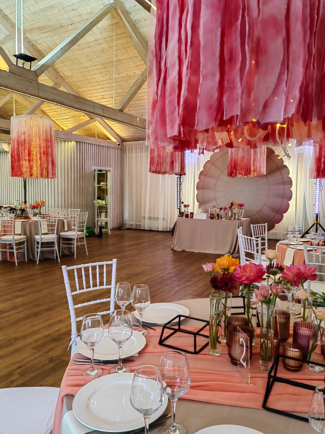 Для своей свадьбы пара выбрала яркий декор в кораллово-розовых оттенках. Сам образ парашюта был использован на свадьбе в двух ипостасях — в виде «цветочка» парашюта сверху и в виде имитации парашюта в виде люстр.