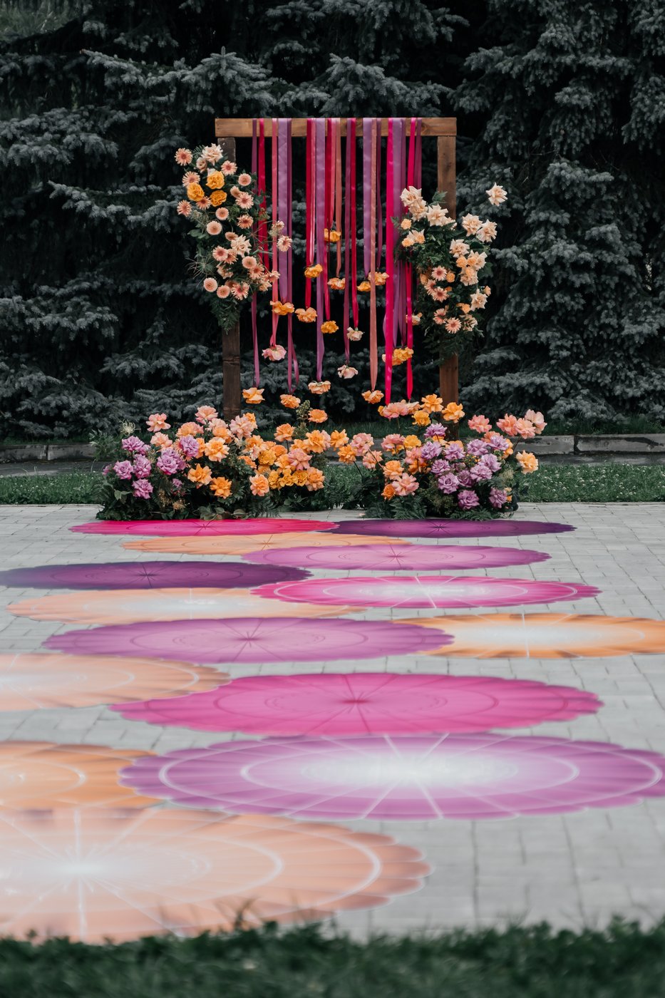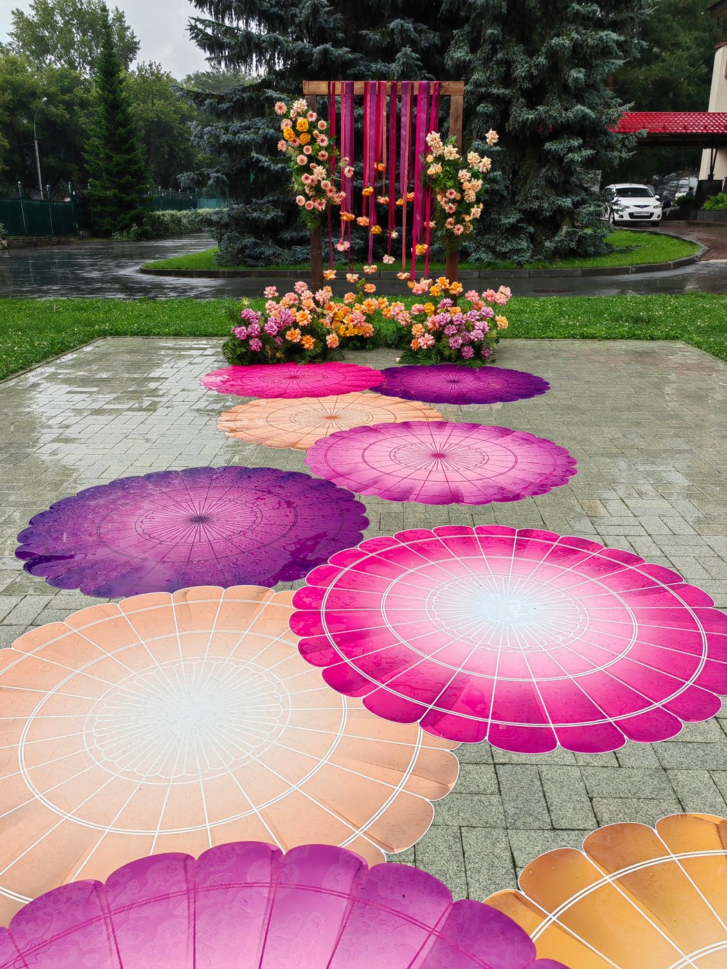 На выездной регистрации классическая деревянная арка, которую обязательно видели ребята для своей церемонии, была модифицирована. Ленты напоминали стропы, а дорожка к арке была сложена из парашютов разного цвета и размера.
