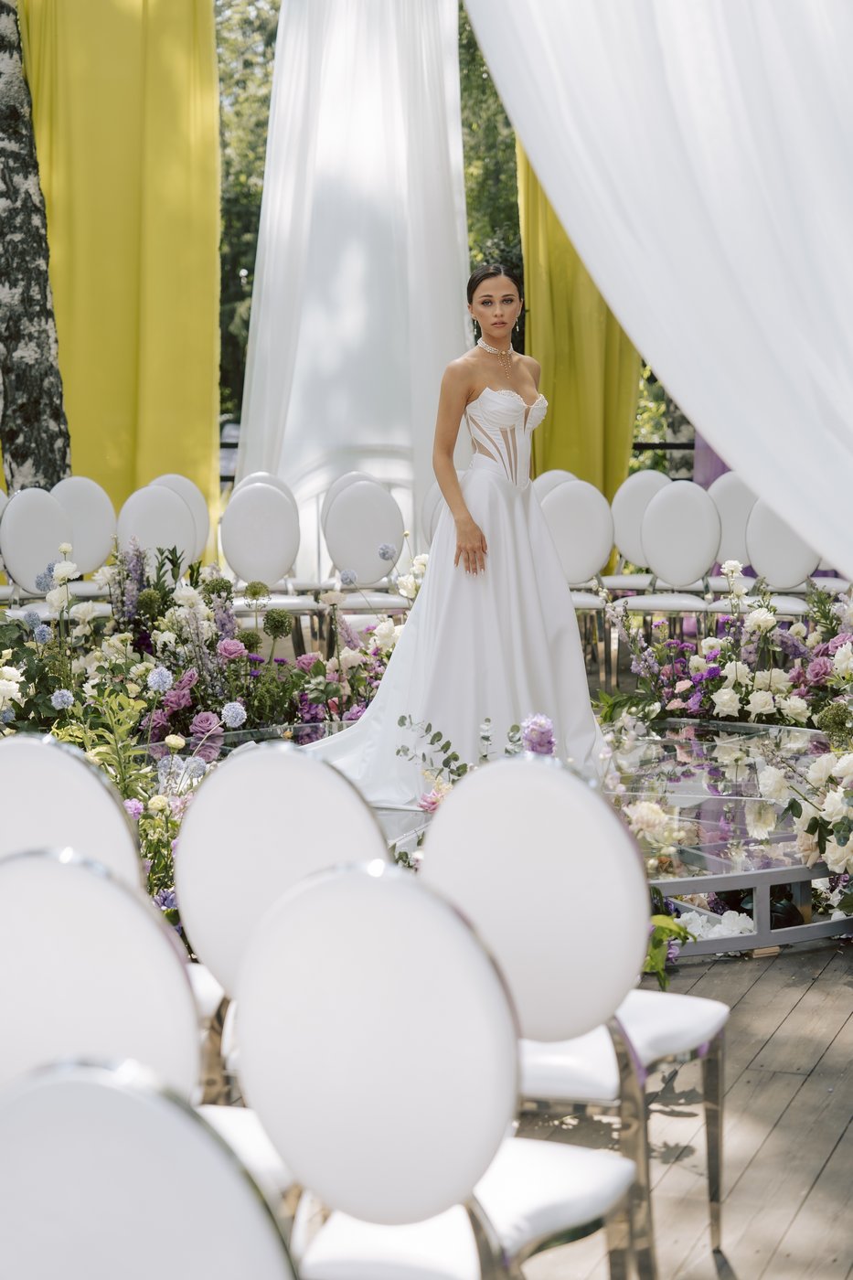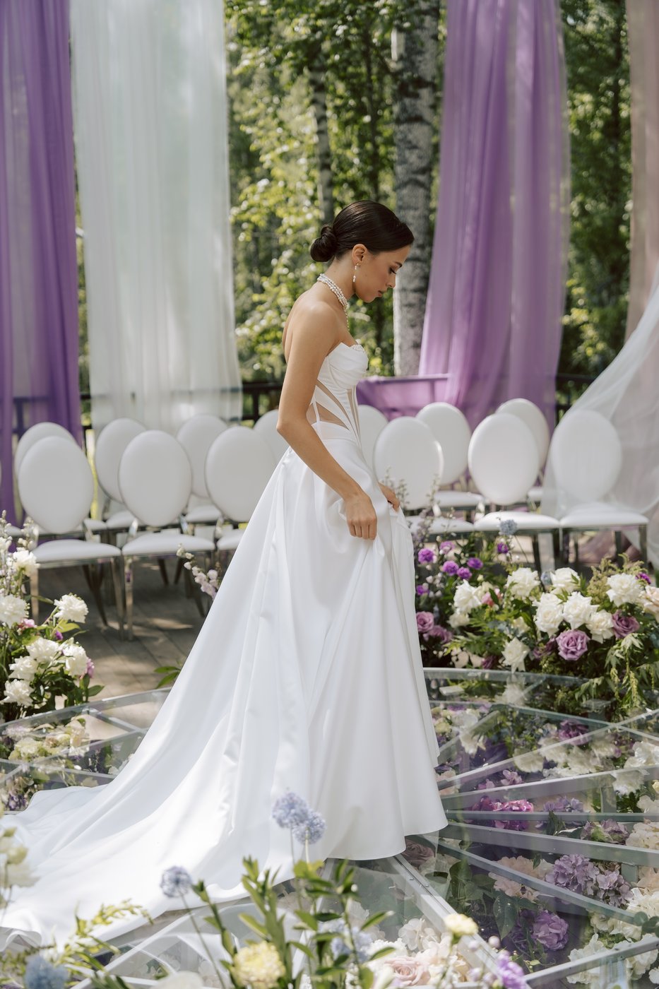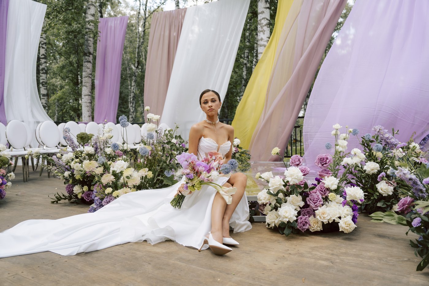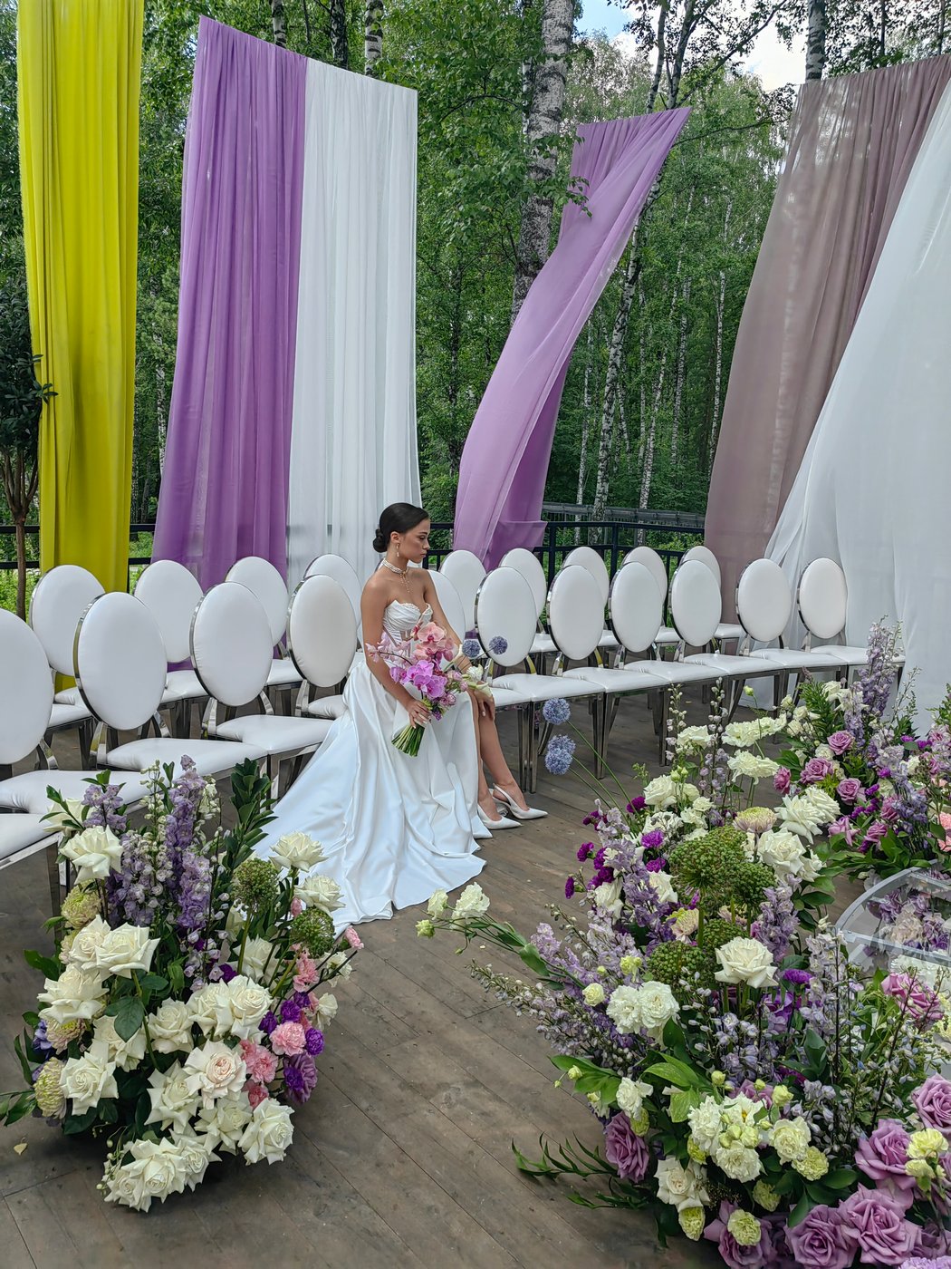 Для монтажа декора в зале и на террасе нами мы прибыли на площадку гораздо заранее, ранним утром. В работе участвовало порядка 15 человек — флористы, декораторы и монтажники. Тросы и ткани натягивались на строительных лесах и отпаривались также. Подиум был сварен и приготовлен заранее, флористику, даже букет, мы собирали на месте.