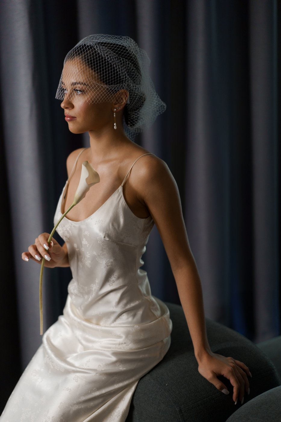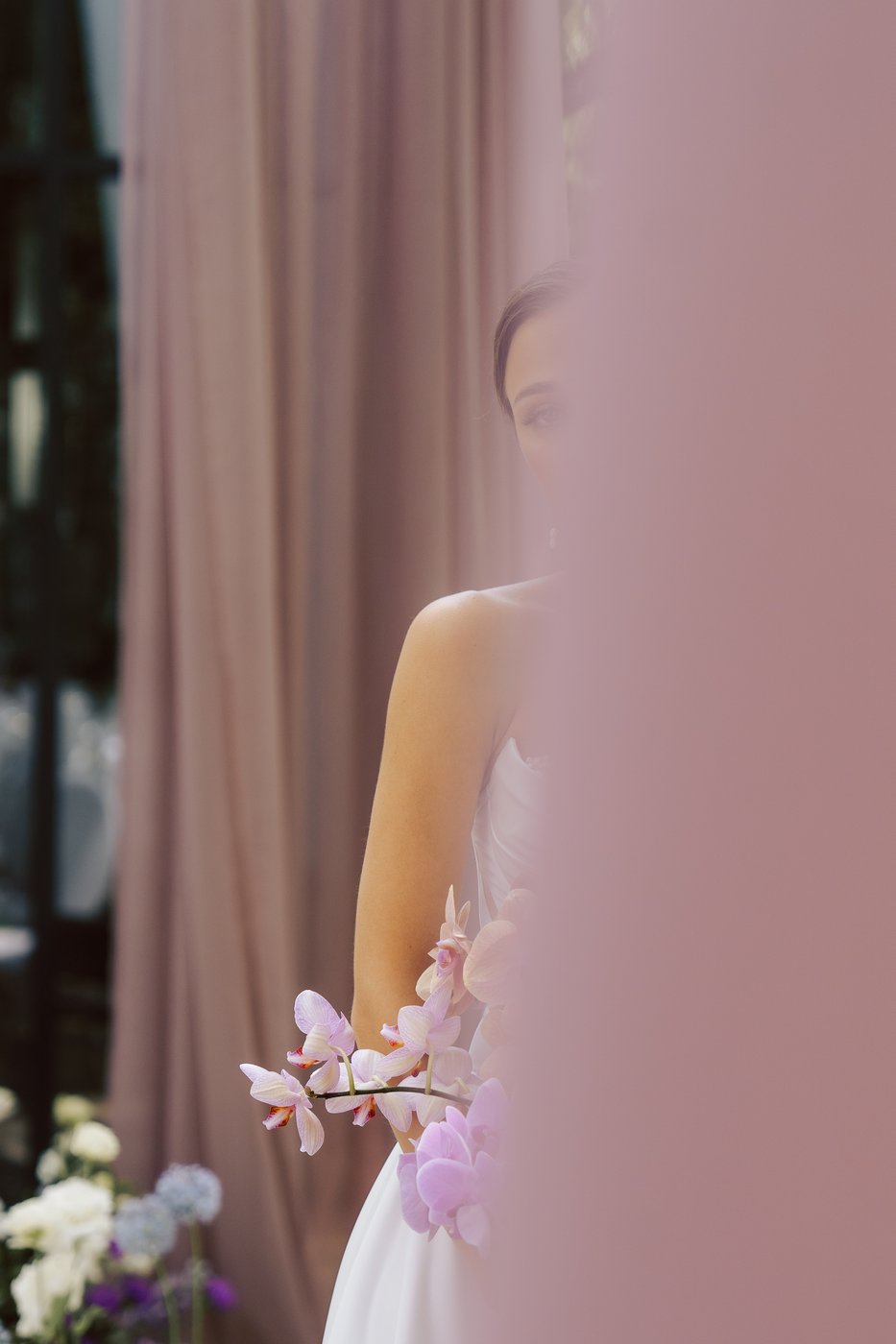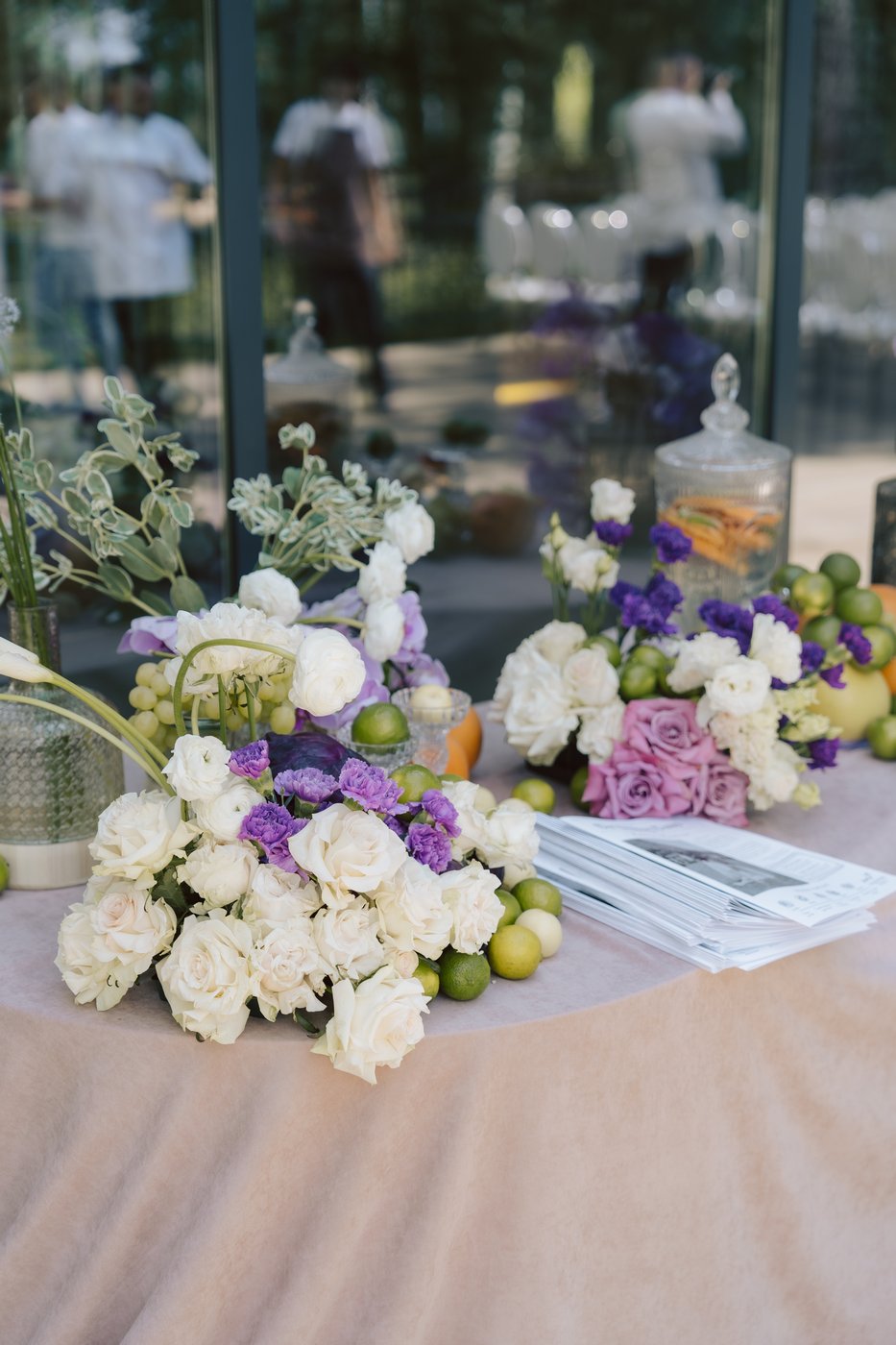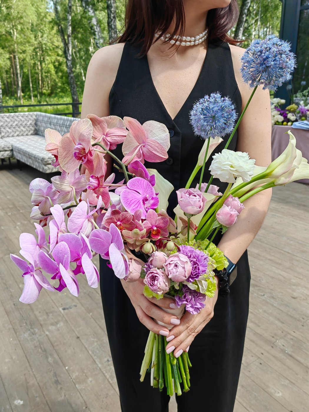 Для монтажа декора в зале и на террасе нами мы прибыли на площадку гораздо заранее, ранним утром. В работе участвовало порядка 15 человек — флористы, декораторы и монтажники. Тросы и ткани натягивались на строительных лесах и отпаривались также. Подиум был сварен и приготовлен заранее, флористику, даже букет, мы собирали на месте.