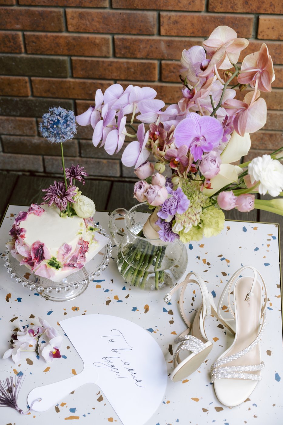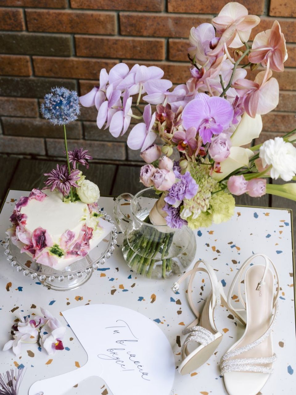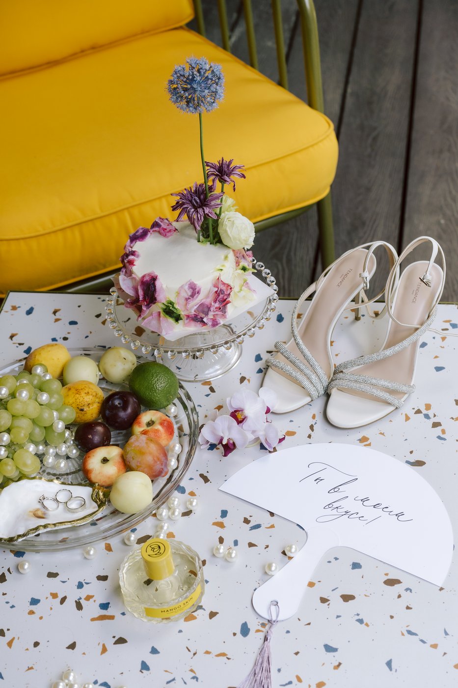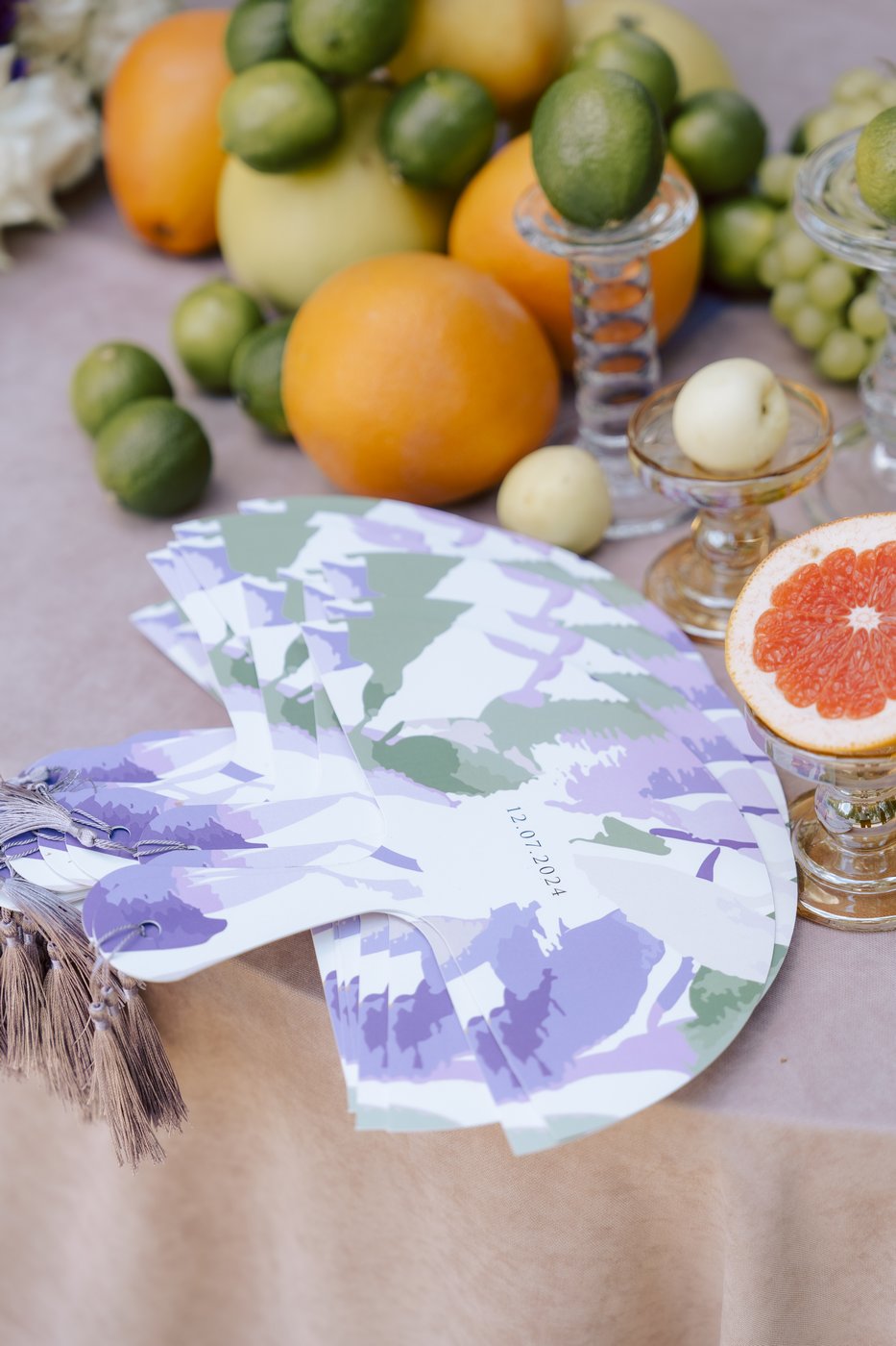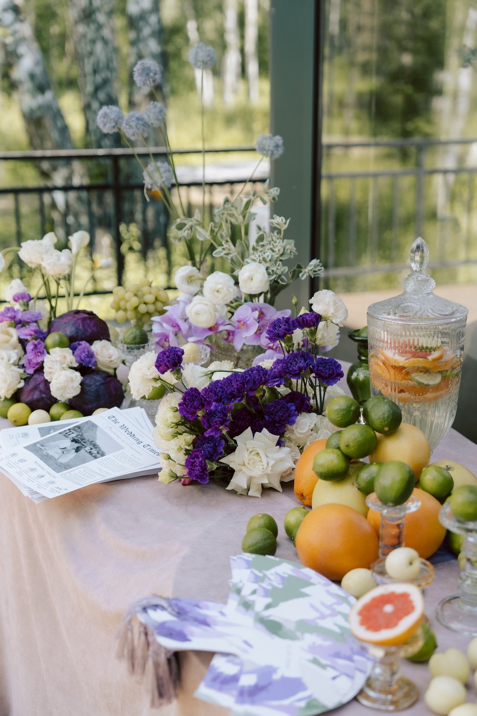 В зале полностью заменили текстиль — скатерти, салфетки. Стол молодоженов мы привезли с собой, легкий, полукруглый. Частично полотна были добавлены и в зал, для декора фона за молодыми и зонирования пространства. Столы мы украсили яркими летними цветами и фруктами. Для свадьбы ребят было приготовлено много деталей — для съемки, веера для гостей, газеты о ребятах, которые лежали на зоне велкома.