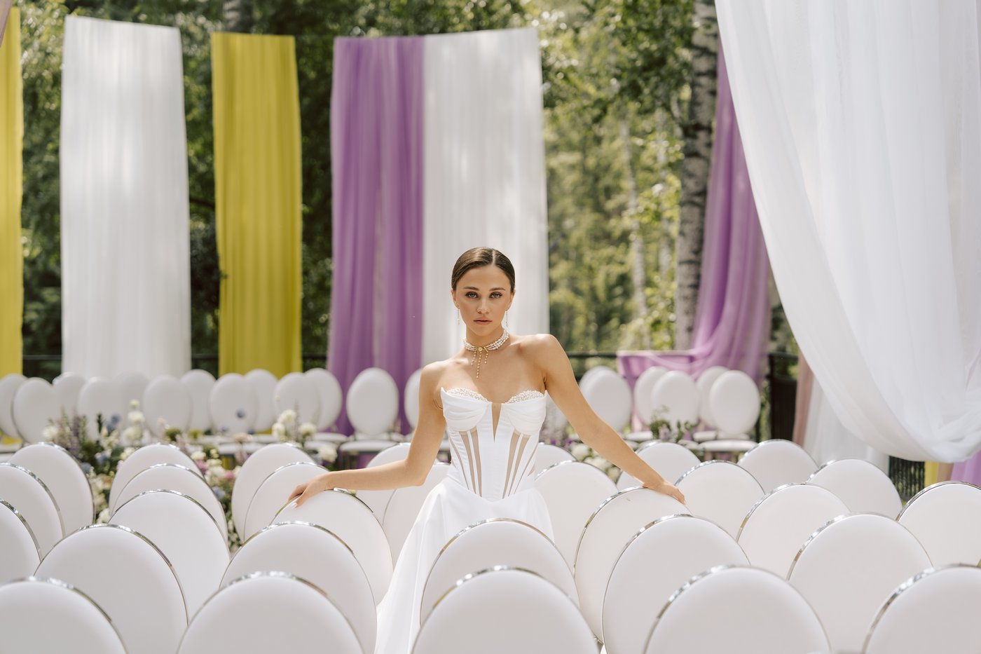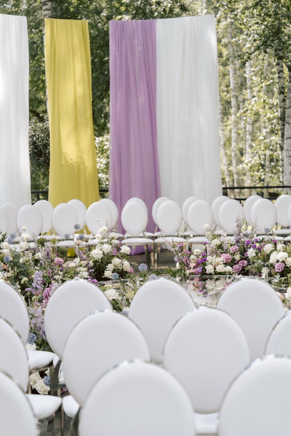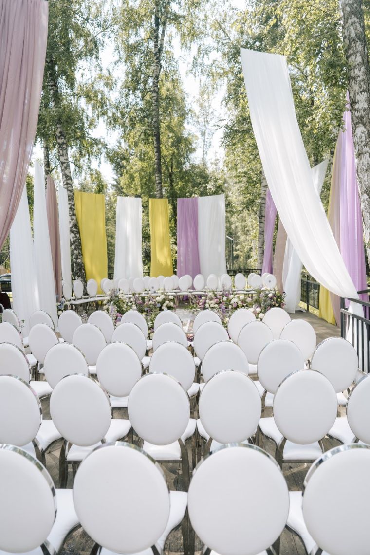 Мы решили поэкспериментировать с зоной выездной регистрации. Мы не только расположили ее в другом месте, где обычно алтарь не размещается, но и сознательно отказались от громоздких конструктивов. Для натяжки троса для полотен мы использовали лишь деревья на площадке.
