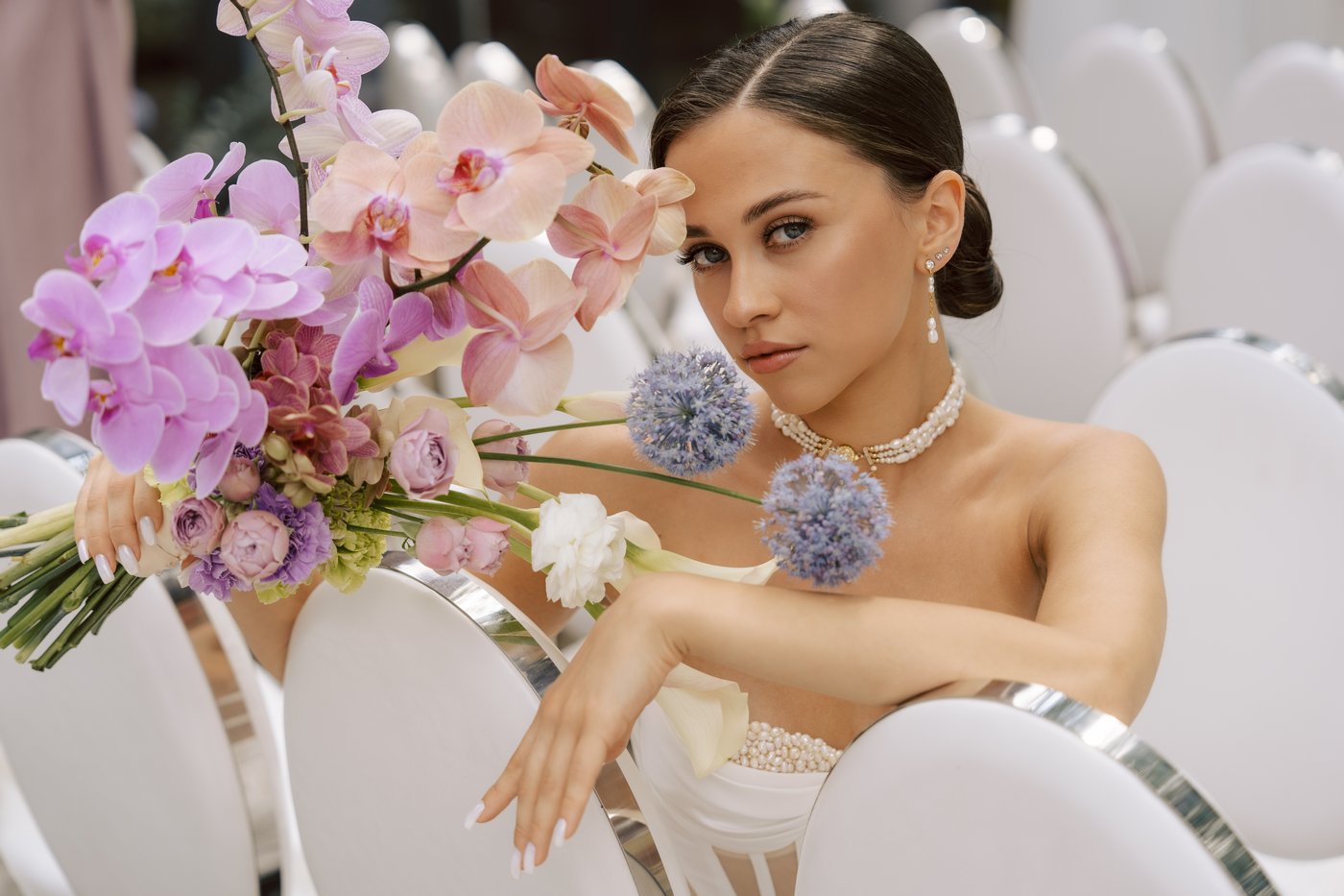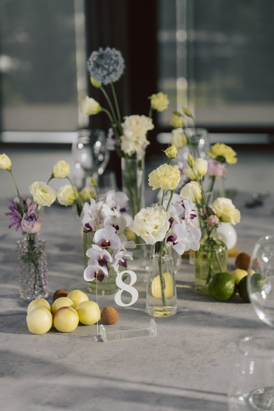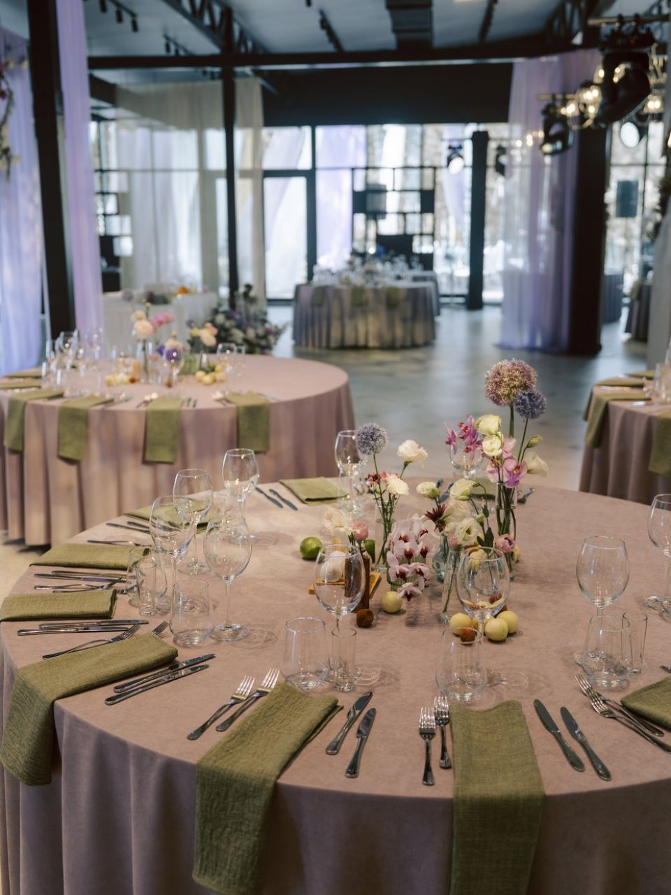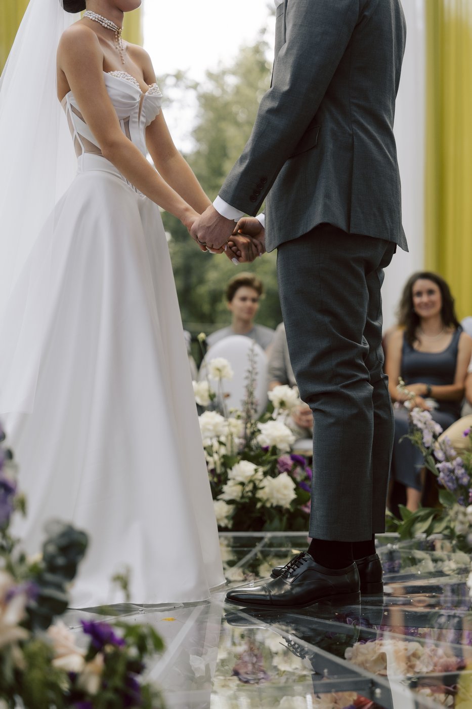 Гостей мы разместили заведомо «хаотично», легко. А сами молодожены стояли на прозрачном подиуме, вокруг и внутри которого благоухали цветы.